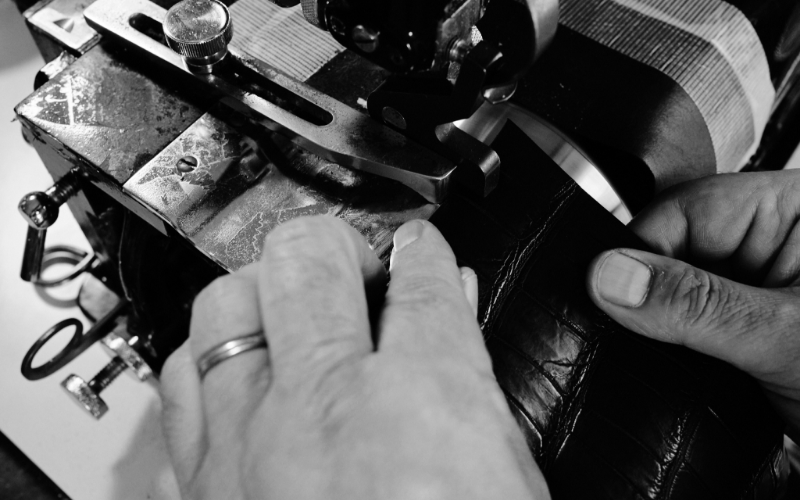 良質なクロコダイルレザーを自ら選定してきた。特殊な構造と繊細さゆえに世界でも20数社と言われるクロコダイルタンナーの中でも、素材選定、裁断、縫製までの工程を一貫して生産することができる日本の職人。