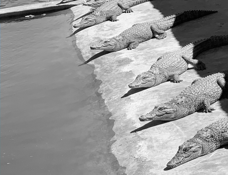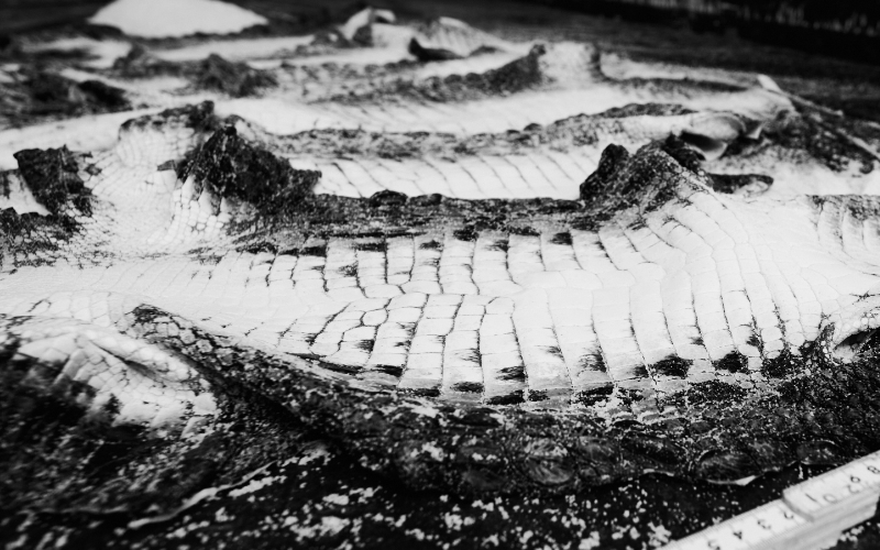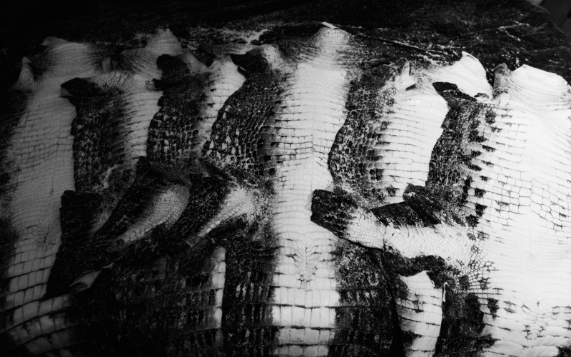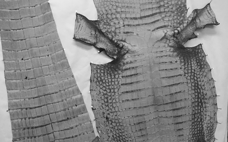 弊社ではクロコダイルの原産地(アフリカ、オーストラリア)に直接検品に行き、自社製品にふさわしいスキンを選別し生皮(raw skin)輸入しその後国内でも鞣したスキン(スラスト)を染色前に更に選別